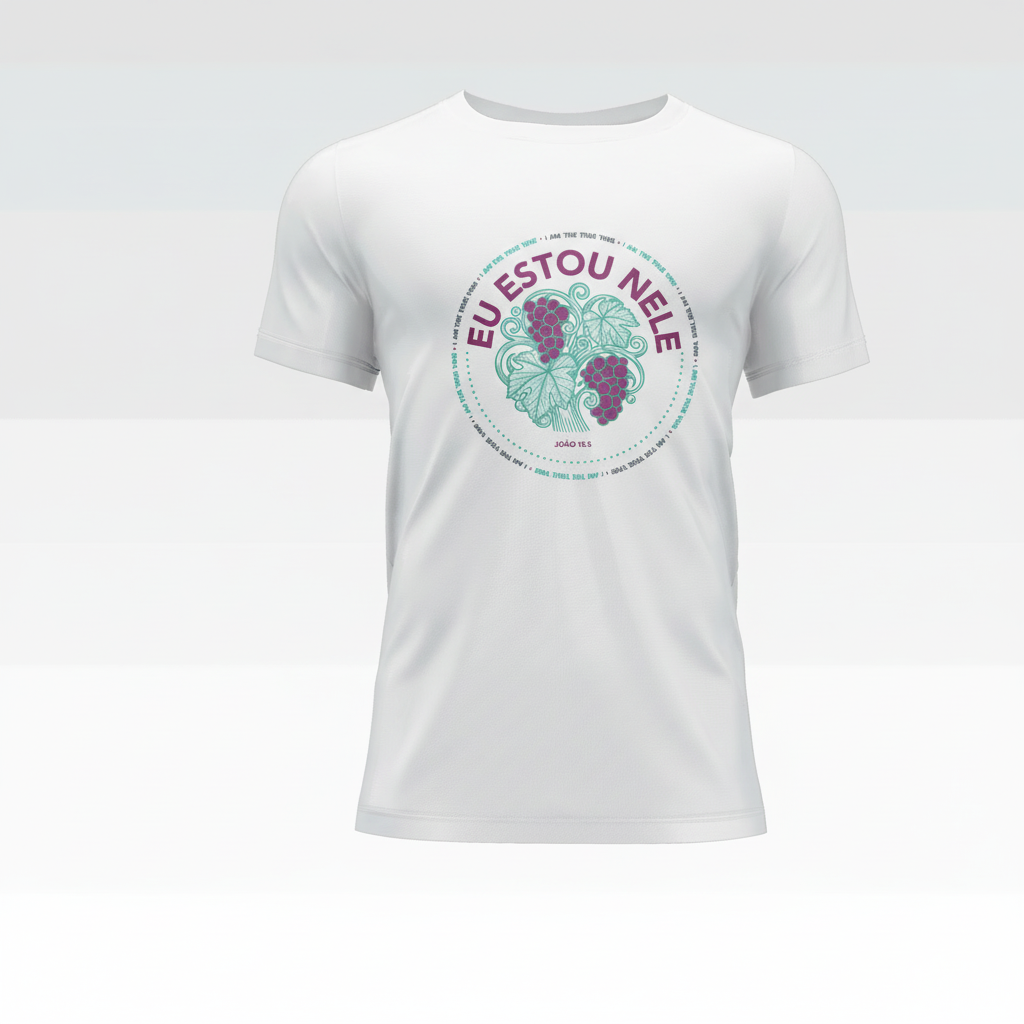 T-shirt branca com estampagem “Eu estou N´Ele” no peito.