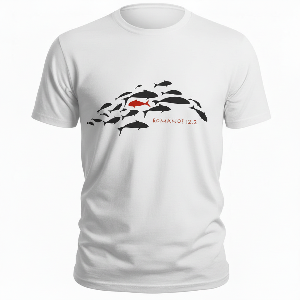 T-shirt branca com estampagem de “Peixes” (Romanos 12.2) no peito.
